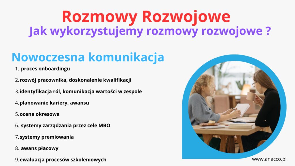 Prawidłowe umiejętności komunikacji interpersonalnej wśród menedżerów są obecnie standardem wymaganym zarówno przez organizację jak również zdecydowanie oczekiwanym przez pracowników. Tworzenie odpowiedniej kultury organizacyjnej, wartości, pozytywnego motywowania pracownika odnoszą zdecydowanie lepsze rezultaty niż dyrektywne systemy nakazowe kontrolne. Szkolenie w zakresie rozmów rozwojowych i oceniających jest zalecane zarówno jako szkolenie przypominające, doskonalące umiejętności menedżerów. Mówimy tu o typowych procesach delegowania i zarządzania przez cele. Jest oczywiście zalecane wszędzie tam gdzie menedżer pracuje z pracownikiem. Będzie to więc proces wdrożenia nowego pracownika – onboarding organizacji. Dotyczy to procesów planowania potrzeb szkoleniowych, zarządzania awansem pracownika, poszukiwania talentów. Rozmowy rozwojowe to również szkolenia związane z wynikami badań organizacji, badań w zakresie zaangażowania i motywacji pracowników, które często wskazują na zbyt niskie zaangażowanie kadry kierowniczej w stosunku do pracowników i roszczeniowe postawy w zakresie wykonywanych zadań. W takim przypadku umiejętność prowadzenia rozmów, motywowania angażowania, tworzenia odpowiedniego klimatu organizacyjnego będzie szczególnie ważna. Najbardziej oczywistym systemem w którym rozmowa rozwojowa jest wykorzystywana to oczywiście okresowe oceny pracowników a co za tym idzie zarządzanie awansem w tym zarządzanie systemem wynagradzania i awans płacowy.